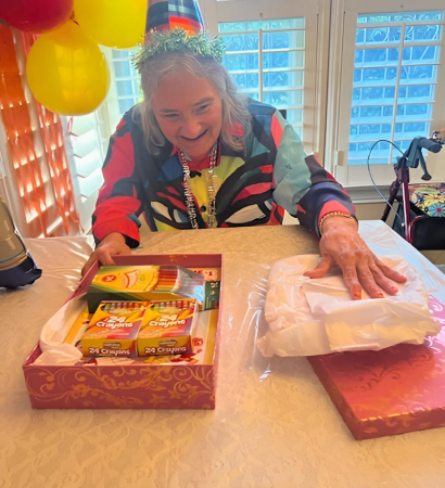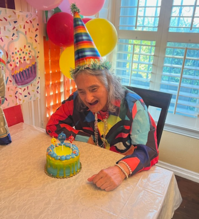 This celebration was not just a birthday—it was a testament to our commitment to making each client feel special, appreciated, and embraced by our extended family. With a heart full of gratitude and the spirited energy that makes her unique, she delighted in every detail of the day. From her vibrant birthday hat to the cheerful cake with bright balloons, each element of the celebration was planned with her in mind, making it a day to remember.
